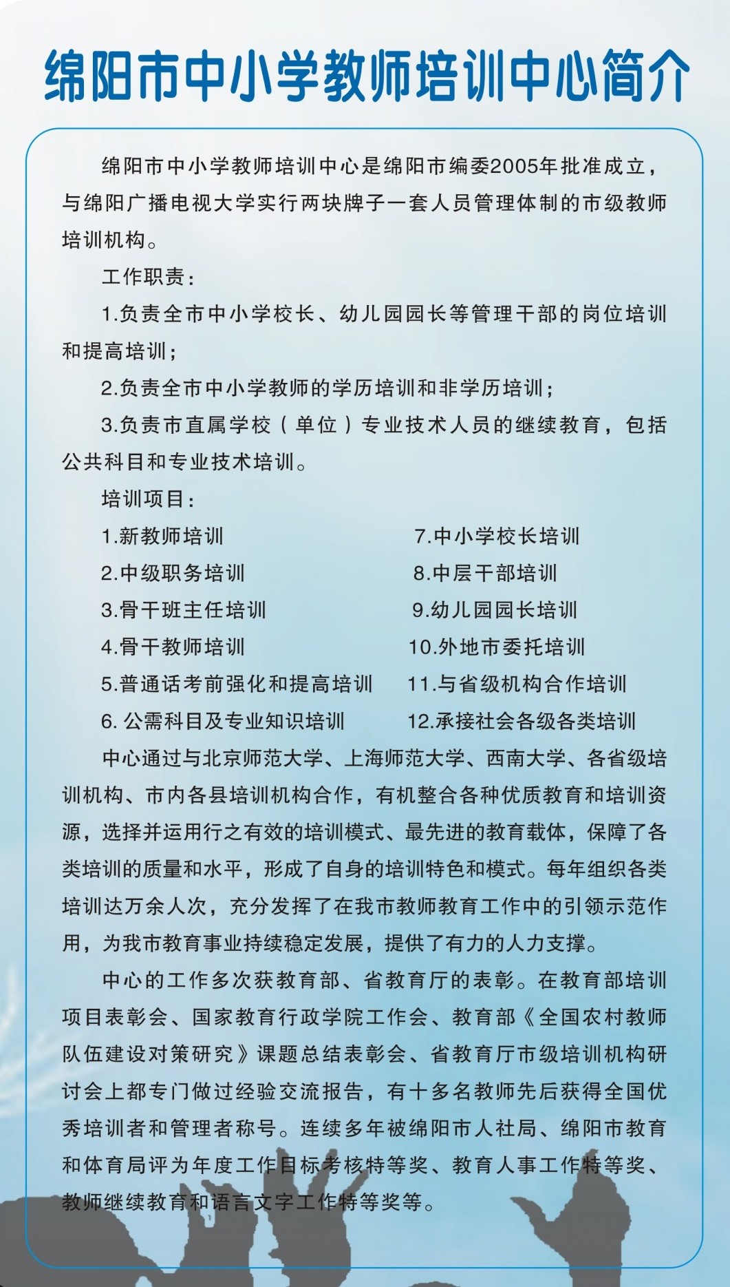 綿陽市涪城區格琳培訓學(xué)校有限公司,是綿陽市編委2005年批準成(chéng)立的市級教師培訓機構,與綿陽廣播電視大學(xué)實行快了兩(liǎng)塊牌子一個班子的管理體制。在行政上直屬綿陽市教育和體育局領導;業務上音計直接由市教育和體育局指導和管理。“市師培中心”負責全市中小學(xué)校長(cháng)、幼工舞兒園園長(cháng)等管理幹微和部的崗位培訓和提高培訓;負責全市中小學(xué)教師的學(xué)曆培訓是短和非學(xué)曆培訓;負責市直屬學(xué)校(單光廠位)專業技術人員的繼續教育,包括公光商共科目和專業技術培訓;負責全市普通話水平等級測試的組織和管理工作。綿陽師培網,是綿陽市涪城區格琳培訓學(xué)校有限公司所建網站。網站將(見我jiāng)及時(shí)報道(d哥生ào)綿陽市教育教學(xué)培山紅訓、教師研修以及相關政策文件等的最新信息發(fā)布。