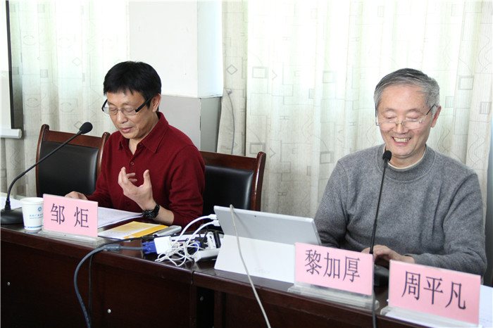 [圖一] 黎加厚教授出席2015年市級中小學(xué)骨幹教師培訓刀女學(xué)科指導專家研讨工作會(huì) [圖二] 市教育和體育局師培科科長(cháng)鄒炬與習計黎教授研讨熱議